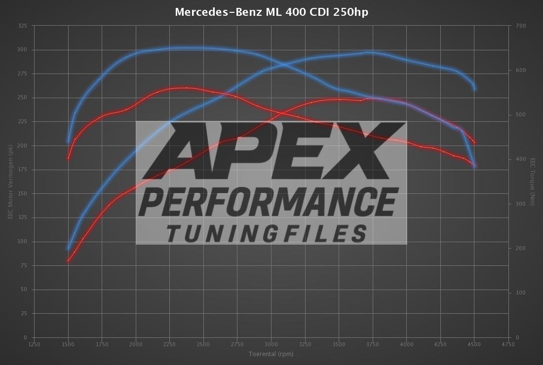 APEXtuningfiles is leading in the development of Mercedes-Benz ML 400 CDI 250hp tuning files. The development of each Mercedes-Benz ML 400 CDI 250hp tuning file is the result of perfection and dedication by APEXtuningfiles programmers. The organization only uses the latest technologies and has many years experience in ECU remapping software. Many (chiptuning) organizations around the globe download their tuning files for Mercedes-Benz ML 400 CDI 250hp at APEXtuningfiles for the best possible result. All Mercedes-Benz ML 400 CDI 250hp tuning files deliver the best possible performance and results within the safety margins.